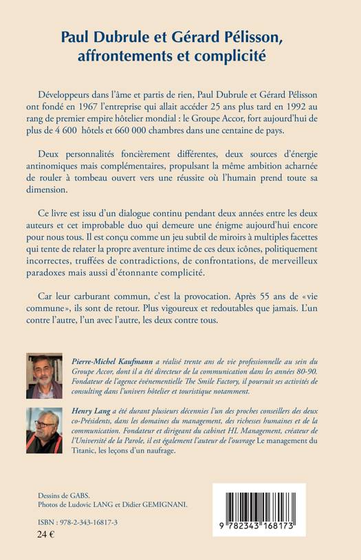 Développeurs dans l'âme et partis de rien, Paul Dubrule et Gérard Pélisson ont fondé en 1967 l'entreprise qui allait accéder 25 ans plus tard en 1992 au rang de premier empire hôtelier mondial : le groupe Accor, fort aujourd'hui de plus de 4 600 hôtels et 660 000 chambres dans une centaine de pays. Ce livre est issu d'un dialogue continu pendant deux années entre les deux auteurs et les deux fondateurs. Il est conçu comme un jeu subtil de miroirs à multiples facettes qui tente de relater la propre aventure intime de ces deux icônes, politiquement incorrectes, truffées de contradictions, de confrontations mais aussi d'une étonnante complicité.