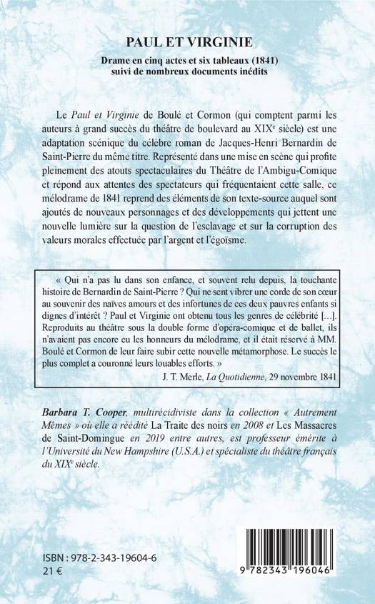Le Paul et Virginie de Boulé et Cormon est une adaptation scénique du célèbre roman de Jacques-Henri Bernardin de Saint-Pierre. Ce mélodrame de 1841 reprend des éléments de son texte-source auquel sont ajoutés de nouveaux personnages et des développements qui jettent une nouvelle lumière sur la question de l'esclavage et sur la corruption des valeurs morales effectuée par l'argent et l'égoïsme.