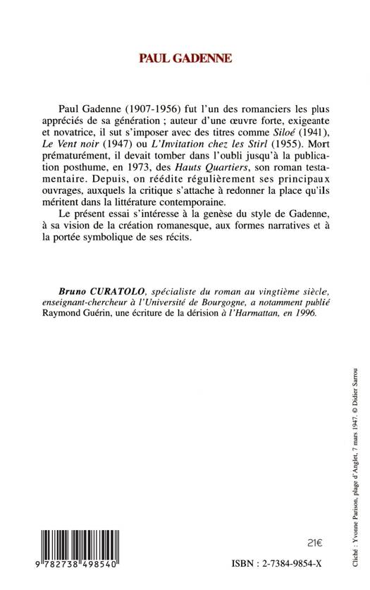 Paul Gadenne (1907-1956) fut l'un des romanciers les plus • appréciés de sa génération; auteur d'une œuvre forte, exigeante et novatrice, il sut s'imposer avec des titres comme Siloé (1941), Le Vent noir (1947) ou L'invitation chez les Stirl (1955). Mort prématurément, il devait tomber dans l'oubli jusqu'à la publica­tion posthume, en 1973, des Hauts Quartiers, son roman testa­mentaire. Depuis, on réédite régulièrement ses principaux ouvrages, auxquels la critique s'attache à redonner la place qu'ils méritent dans la littérature contemporaine.