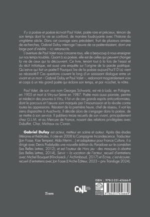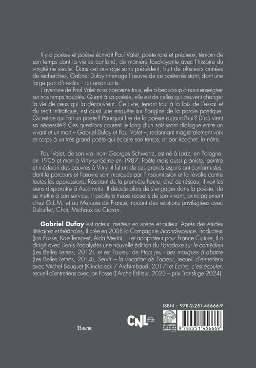 ll y a poesie et poesie ecrivait Paul Valet, poete rare et precieux, temoin de sontemps dont la vie se confond, de maniere foudroyante avec l'histoire du vingtieme siecle. Dans cet ouvrage sans precedent, fruit de plusieurs annees de recherches, Gabriel Dufay interroge l'oeuvre de ce poete-resistant, dont une large part d'inedits - ici retranscrits. L'aventure de Paul Valet nous concerne tous, elle a beaucoup a nous enseigner sur nos temps troubles. Quant a sa poesie, elle est de celles qui peuvent changer la vie de ceux qui la decouvrent. Ce livre, tenant tout a la fois de l'essai et du recit initiatique, est aussi une enquete sur l'origine de la parole poetique. Qu'est-ce qui fait un poete ? Pourquoi lire de la poesie aujourd'hui ? D'ou vient sa necessite ? Ces questions courent le long d'un saisissant dialogue entre un vivant et un mort - Gabriel Dufay et Paul Valet -, redonnant magistralement voix et corps a un tres grand poete nqui eclaire son temps, et par ricochet, le notre. Paul Valet, de son vrai nom Georges Schwartz, est ne a Lodz, en Pologne, en 1905 et mort a Vitry-sur-Seine en 1987. Poete mais aussi pianiste, peintre et medecin des pauvres a Vitry, il fut un de ces grands esprits anticonformistes, dont le parcours et l'oeuvre sont marques par l'insoumission et la revolte contre toutes les oppressions. Resistant de la premiere heure, chef de reseau, il voit les siens disparaitre a Auschwitz. Il decide alors de s'engager dans la poesie, de se mettre a son service. Il publiera treize recueils de son vivant, principalement chez G.L.M. et au Mercure de France, nouant des relations privilegiees avec Dubuffet, Char, Michaux ou Cioran.
