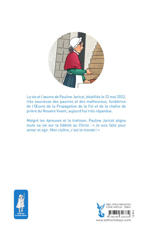 Née à Lyon en 1799, Pauline Jaricot est le 7e enfant d'une famille de riches industriels. Elle reçoit une éducation chrétienne, puis elle se laisse prendre dans une vie mondaine et se convertit à l'adolescence , elle mène alors une vie de prière et de pauvreté tout en restant laïque : « Je suis faite pour aimer et agir. Mon cloître, c'est le monde ! » Elle s'engage dans le christianisme social, notamment aux côtés des canuts de Lyon, ces ouvriers de la soie qui vivent dans des conditions précaires. Elle fonde l'Œuvre Pontificale de la Propagation de la Foi, devenue aujourd’hui les OPM, ainsi que le Rosaire Vivant, une chaîne de prière qui connaît de nouveau un grand succès aujourd'hui auprès des familles. Trahie, couverte de dettes et écartée de son œuvre, elle meurt dans la misère le 9 janvier 1862. Elle a été béatifiée par le pape François le 22 mai 2022.