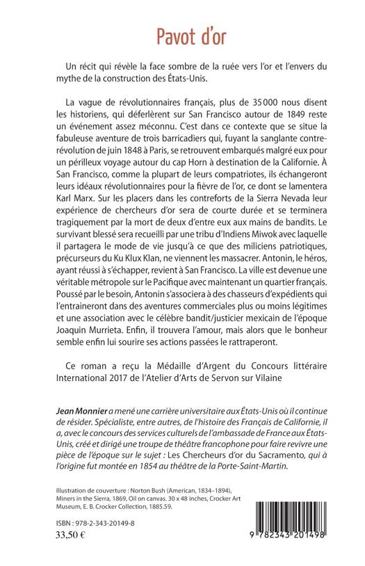 La vague de révolutionnaires français qui déferlèrent sur San Francisco autour de 1849 reste un événement assez méconnu. C'est dans ce contexte que se situe la fabuleuse aventure de trois barricadiers qui, fuyant la sanglante contre-révolution de juin 1848 à Paris, se retrouvent embarqués malgré eux pour un périlleux voyage autour du cap Horn à destination de la Californie. À San Francisco, ils échangeront leurs idéaux révolutionnaires pour la fièvre de l'or. Sur les placers dans les contreforts de la Sierra Nevada leur expérience de chercheurs d'or se terminera tragiquement par la mort de deux d'entre eux. Antonin, blessé, sera recueilli par une tribu d'Indiens Miwok. Ce roman a reçu la Médaille d'Argent du Concours littéraire International 2017 de l'Atelier d'Arts de Servon sur Vilaine.