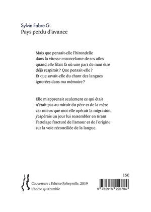 Avec « Pays perdu d’avance », Sylvie Fabre G. a porté son écriture dans ce qu’elle appelle un « registre lyrique ». Ce tournant, ou plutôt ce passage exceptionnel vers une écriture plus classique s’est imposé à elle avec la disparition de sa mère. En relatant des moments de son enfance, la poète retourne aux sources de l'enfance, et aussi, et surtout, aux sources de sa poésie. Les thèmes de Pays perdu d’avance retrouvent les grandes images et figures fondatrices de la vie et de son œuvre. « Sans doute reviens-je aux racines réelles et irréelles de la langue, nous dit Sylvie Fabre G., celles qui constituent la mienne en particulier. Le texte est aussi traversé par le souffle des lectures de certains poètes. Le rapport à la mort et à l’origine, les exils, l’amour et la douleur l’habitent aussi. » Le peintre Fabrice Rebeyrolle est allé au plus profond des poèmes pour mettre des couleurs sur les sentiments qui ont fait naître la poésie de Sylvie Fabre G.
