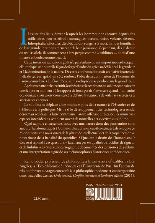 Il existe des lieux devant lesquels les hommes ont eprouve depuis des millenaires peur et effroi: montagnes, oceans, forets, volcans, deserts. Inhospitaliers, hostiles, desoles, ils font songer a la mort, ils nous humilient de leur grandeur et nous menacent de leur puissance. Cependant, des le debut du XVIIIe siecle, ils commencent a etre percus comme sublimes, dotes d'une intense et bouleversante beaute. Cette inversion radicale du gout n'a pas seulement une importance esthetique: elle implique une nouvelle facon de forger l'individu grace au defi lance a la grandeur et a la domination de la nature. De cette confrontation nait un plaisir inattendu mele de terreur, qui, d'un cote renforce l'idee de la domination de l'homme, de l'autre, contribue a lui faire decouvrir la volupte de se perdre dans le grand tout. Apres avoir atteint leur zenith, les theories et le sentiment du sublime connaissent une eclipse au moment ou le rapport de force parait s'inverser: quand l'humanite occidentale croit avoir commence a defaire la nature, a devoiler ses secrets et a asservir ses energies. Le sublime se deplace alors toujours plus de la nature a l'Histoire et de l'Histoire a la politique. Meme si le developpement des technologies a rendu desormais scelerate la lutte contre une nature offensee et blessee, les immenses espaces intersideraux semblent ouvrir de nouvelles perspectives au sublime. Quel rapport entretenons-nous avec une nature dont des pans entiers sont aujourd'hui domestiques ? Comment le sublime peut-il continuer a developper ce role qui consiste a nous sauver de la platitude intellectuelle et de la torpeur emotive nous tirant de la banalite du quotidien ? Quel est le destin de l'humanisme ? Cet essai repond a ces questions - fascinant par ses qualites de lucidite, de rigueur et de lisibilite - a travers une cartographie documentee des territoires du sublime et une interpretation aigue de ses metamorphoses historiques et theoriques.