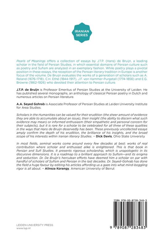 Pearls of Meanings offers a collection of essays by J.T.P. (Hans) de Bruijn, leading scholar in the field of Persian Studies, in which essential domains of Persian culture such as poetry and Sufism are analyzed in an exemplary fashion. While poetry plays a pivotal position in these essays, the reception of Persian literary tradition in Europe is another focus of the volume, thereby representing the studies of a generation of scholars such as A. Reland (1676-1718), C.H. Ethé (1844-1917), J.F. von Hammer-Purgstall (1774-1856) and E.G. Browne (1862-1926) who devoted their attention to Persian culture.