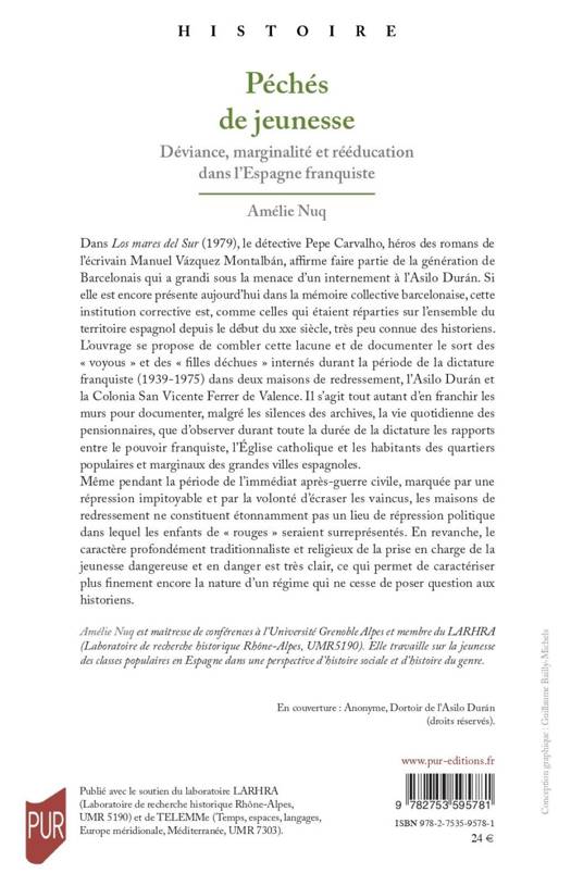 Dans Los mares del Sur (1979), le détective Pepe Carvalho, héros des romans de l’écrivain Manuel Vázquez Montalbán, affirme faire partie de la génération de Barcelonais qui a grandi sous la menace d’un internement à l’Asilo Durán. Si elle est encore présente aujourd’hui dans la mémoire collective barcelonaise, cette institution corrective est, comme celles qui étaient réparties sur l’ensemble du territoire espagnol depuis le début du xxe siècle, très peu connue des historiens. L’ouvrage se propose de combler cette lacune et de documenter le sort des « voyous » et des « filles déchues » internés durant la période de la dictature franquiste (1939-1975) dans deux maisons de redressement, l’Asilo Durán et la Colonia San Vicente Ferrer de Valence. Il s’agit tout autant d’en franchir les murs pour documenter, malgré les silences des archives, la vie quotidienne des pensionnaires, que d’observer durant toute la durée de la dictature les rapports entre le pouvoir franquiste, l’Église catholique et les habitants des quartiers populaires et marginaux des grandes villes espagnoles.