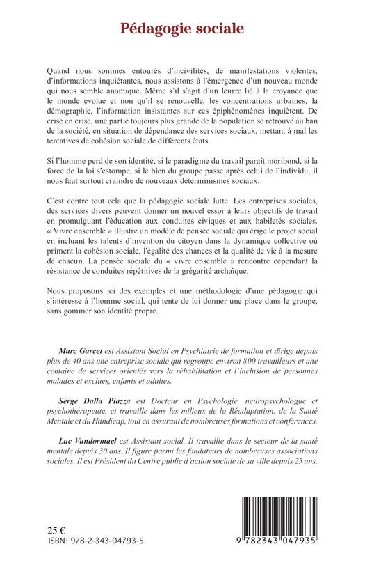 De crise en crise, une partie toujours plus grande de la population se retrouve au ban de la société, en situation de dépendance des services sociaux, mettant à mal les tentatives de cohésion sociale des états. C'est contre tout cela que la pédagogie sociale lutte. "Vivre ensemble" illustre un modèle de pensée sociale qui érige le projet social en incluant les talents d'invention du citoyen dans la dynamique collective où priment la cohésion sociale, l'égalité des chances et la qualité de vie.