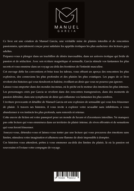 Ce livre est une création de Manuel Garcia, une véritable mine de plaisirs interdits et de rencontres passionnées, spécialement conçue pour satisfaire les appétits érotiques les plus audacieux des lecteurs gays adultes.Prépare-toi à te plonger dans un tourbillon de désirs inavouables, dans un univers érotique qui brûle de passion et de séduction. Avec son écriture magnétique et sensuelle, Garcia stimule tes fantasmes les plus secrets, t'emmenant dans un voyage au-delà des frontières de l'intimité masculine.Cet ouvrage défie les conventions et brise tous les tabous, t'offrant un aperçu des rencontres les plus explosives, des connexions les plus profondes et des plaisirs les plus extatiques. Les pages de ce livre révèlent des histoires qui te tiendront collé aux mots, éveillant un désir que tu ne pourras pas ignorer.Laisse-toi emporter dans des mondes inconnus, où le péché est le moteur des émotions les plus intenses. Les personnages créés par García se révèlent dans des rencontres transgressives, dans des moments de passion débridée, dans une symphonie de désir qui enflamme tes fantasmes les plus sombres.L'écriture provocante et détaillée de Manuel García est une explosion de sensualité qui te fera frissonner de plaisir. À travers ses histoires, il t'invite à explorer ta sexualité sans inhibitions, à t'abandonner à tes instincts les plus profonds, sans remords ni retenue.Cette oeuvre de fiction est ton passeport pour un monde de luxure et d'aventures interdites. Ne manque pas cette lecture qui t'emmènera dans un territoire de plaisir intense, de rêves effrontés et de sensations qui te feront frissonner.Assieds-toi, détends-toi et laisse-toi aller à une lecture qui te procurera des émotions sans limites, stimulera ton imagination et allumera une flamme de désir qui ne peut être apprivoisée.Ces histoires t'attendent, prêtes à t'emmener au-delà des limites du plaisir, là où la passion est souveraine et où l'extase est ton compagnon de voyage.