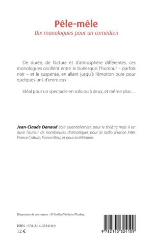 De durée, de facture et d'atmosphère différentes, ces monologues oscillent entre le burlesque, l'humour - parfois noir - et le suspense, en allant jusqu'à l'émotion pure pour quelques-uns d'entre eux. Idéal pour un spectacle en solo ou à deux, et même plus...