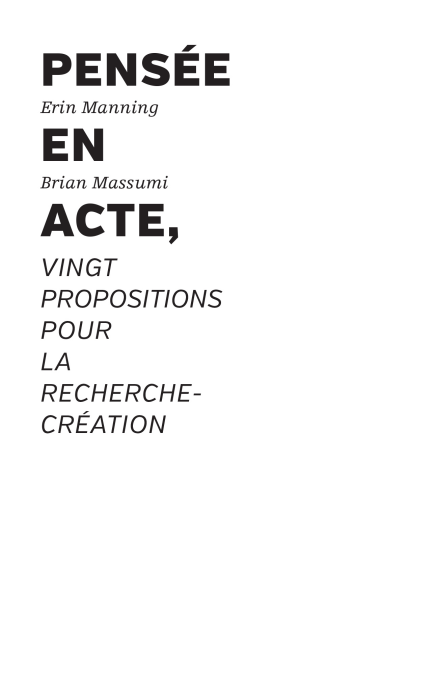 La « recherche-création » monte en puissance en France. Erin Manning et Brian Massumi en sont parmi les plus radicaux théoriciens. Ils se demandent dans ce petit ouvrage quelle écologie de l'expérience mettre en place, entre recherche et création, pour nous aider à penser ensemble et à mettre la pensée en acte. En guise de réponses, ils tirent de leurs expériences vingt propositions décoiffantes et enjouées, qui donnent des envies plutôt que des leçons. Ils sèment ainsi des graines d'événements éminemment politiques, dont notre avenir a bien besoin.