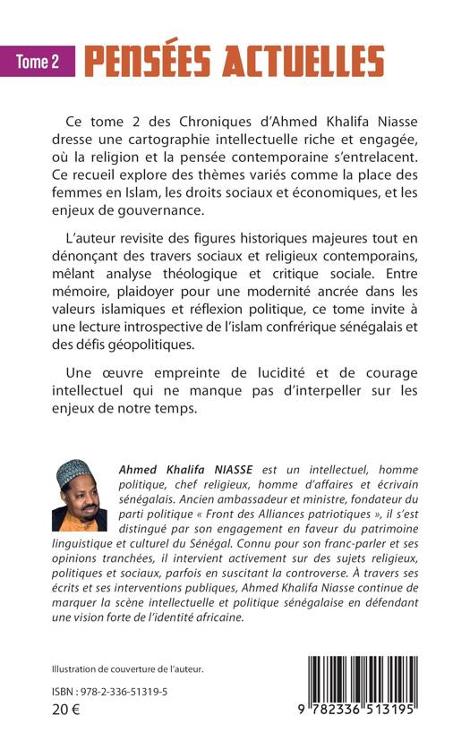 Ce tome 2 des Chroniques d'Ahmed Khalifa Niasse dresse une cartographie intellectuelle riche et engagée, où la religion et la pensée contemporaine s'entrelacent. Ce recueil explore des thèmes variés comme la place des femmes en Islam, les droits sociaux et économiques, et les enjeux de gouvernance. L'auteur revisite des figures historiques majeures tout en dénonçant des travers sociaux et religieux contemporains, mêlant analyse théologique et critique sociale. Entre mémoire, plaidoyer pour une modernité ancrée dans les valeurs islamiques et réflexion politique, ce tome invite à une lecture introspective de l'islam confrérique sénégalais et des défis géopolitiques. Une oeuvre empreinte de lucidité et de courage intellectuel qui ne manque pas d'interpeller sur les enjeux de notre temps.