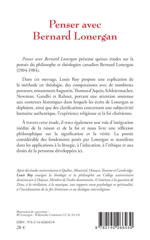 Penser avec Bernard Lonergan présente quinze études sur la pensée du philosophe et théologien canadien Bernard Lonergan (1904-1984). Dans cet ouvrage, Louis Roy propose une explication de la méthode en théologie, des comparaisons avec de nombreux penseurs, notamment Augustin, Thomas d’Aquin, Schleiermacher, Newman, Gandhi et Rahner, portant une attention soutenue aux contextes historiques dans lesquels les écrits de Lonergan se déploient, ainsi que des clarifications concernant une subjectivité humaine authentique, l’expérience religieuse et la foi chrétienne. À travers cette étude, il trace également une voie d’intégration inédite de la raison et de la foi et nous livre une réflexion philosophique sur la signification et la vérité. La portée considérable des fondements posés par Lonergan se manifeste dans les applications à la liturgie, à l’éducation, à l’éthique et aux droits de la personne développées ici.