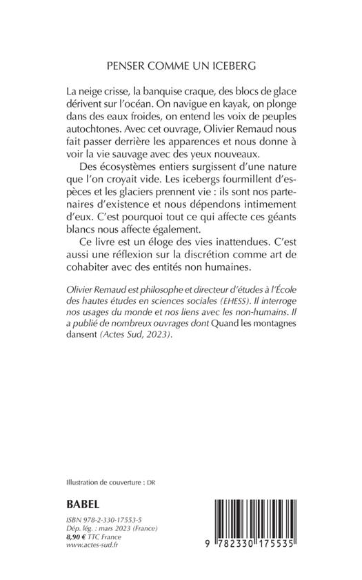 La neige crisse, la banquise craque, des blocs de glace dérivent sur l'océan. On navigue en kayak, on plonge dans des eaux froides, on entend les voix de peuples autochtones. Avec cet ouvrage, Olivier Remaud nous fait passer derrière les apparences et nous donne à voir la vie sauvage avec des yeux nouveaux. Des écosystèmes entiers surgissent d'une nature que l'on croyait vide. Les icebergs fourmillent d'espèces et les glaciers prennent vie : ils sont nos partenaires d'existence et nous dépendons intimement d'eux. C'est pourquoi tout ce qui affecte ces géants blancs nous affecte également. Ce livre est un éloge des vies inattendues. C'est aussi une réflexion sur la discrétion comme art de cohabiter avec des entités non humaines.