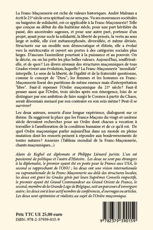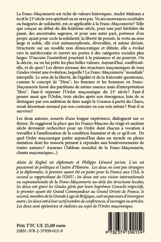 La Franc-Maçonnerie telle que conçue au début du dix-huitième siècle, pour une part héritière du passé, des ancestrales sagesses, et pour une autre part, porteuse d'un projet, ayant pour socle la solidarité, la liberté de pensée, la vertu au sens large et noble, s'est à la fois métamorphosée et diversifiée, pour ne pas dire divisée. Structurée sur un modèle non démocratique et élitiste, elle a évolué vers une sorte de méritocratie et a ouvert progressivement ses portes à des catégories plus larges. On lui prête une puissance et un pouvoir. On la décrie, la vilipende, la porte au pinacle des écoles de sagesse