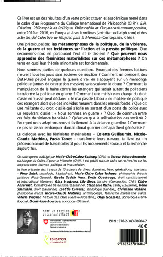 Cet ouvrage collectif rassemble les résultats de travaux d'un vaste projet citoyen et académique mené dans le cadre d'un Programme International de Philosophie "Exil, Création, Philosophie et Politique". Ces réflexions s'articulent autour d'une préoccupation, les métamorphoses de la politique, de la violence de la guerre et ses incidences sur l'action et la pensée politique. Que peuvent nous apprendre des féministes matérialistes sur ces métamorphoses?