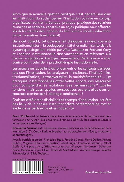 Dans cet objectif, cet ouvrage fait dialoguer les deux courants institutionnalistes – la pédagogie institutionnelle inscrite dans la dynamique singulière initiée par Aïda Vasquez et Fernand Oury, et l’analyse institutionnelle dite vincennoise en référence aux travaux engagés par Georges Lapassade et René Lourau – et en contre-point celui de la psychothérapie institutionnelle.