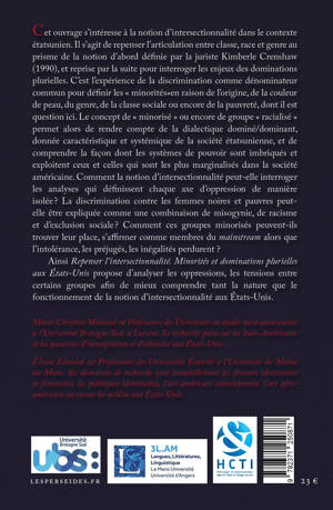 Cet ouvrage s’intéresse à la notion d’intersectionnalité dans le contexte étatsunien. Il s’agit de repenser l’articulation entre classe, race et genre au prisme de la notion d’abord définie par la juriste Kimberle Crenshaw (1990), et reprise par la suite pour interroger les enjeux des dominations plurielles. C’est l’expérience de la discrimination comme dénominateur commun pour définir les « minorités»en raison de l’origine, de la couleur de peau, du genre, de la classe sociale ou encore de la pauvreté, dont il est question ici. Le concept de « minorisé » ou encore de groupe « racialisé » permet alors de rendre compte de la dialectique dominé/dominant, donnée caractéristique et systémique de la société étatsunienne, et de comprendre la façon dont les systèmes de pouvoir sont imbriqués et exploitent ceux et celles qui sont les plus marginalisés dans la société américaine. Comment la notion d’intersectionnalité peut-elle interroger les analyses qui définissent chaque axe d’oppression de manière isolée ? La discrimination contre les femmes noires et pauvres peut-elle être expliquée comme une combinaison de misogynie, de racisme et d’exclusion sociale ? Comment ces groupes minorisés peuvent-ils trouver leur place, s’affirmer comme membres du mainstream alors que l’intolérance, les préjugés, les inégalités perdurent ? Ainsi Repenser l’intersectionnalité. Minorités et dominations plurielles aux États-Unis propose d’analyser les oppressions, les tensions entre certains groupes afin de mieux comprendre tant la nature que le fonctionnement de la notion d’intersectionnalité aux États-Unis.