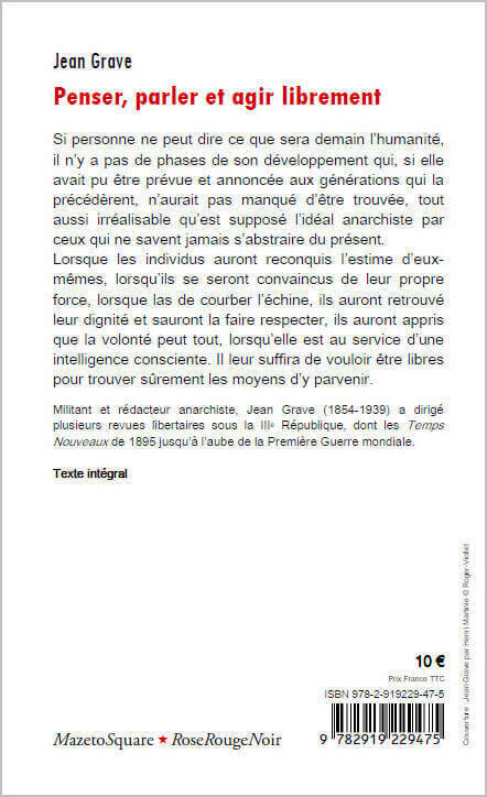 Si personne ne peut dire ce que sera demain l’humanité, il n’y a pas de phases de son développement qui, si elle avait pu être prévue et annoncée aux générations qui la précédèrent, n’aurait pas manqué d’être trouvée, tout aussi irréalisable qu’est supposé l’idéal anarchiste par ceux qui ne savent jamais s’abstraire du présent. Lorsque les individus auront reconquis l’estime d’eux-mêmes, lorsqu’ils se seront convaincus de leur propre force, lorsque las de courber l’échine, ils auront retrouvé leur dignité et sauront la faire respecter, ils auront appris que la volonté peut tout, lorsqu’elle est au service d’une intelligence consciente. Il leur suffira de vouloir être libres pour trouver sûrement les moyens d’y parvenir.