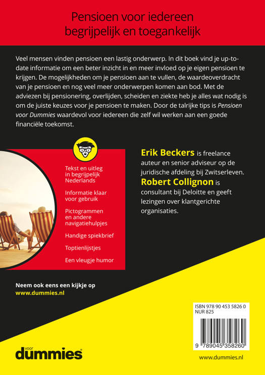 Veel mensen vinden pensioen een lastig onderwerp. In dit boek vind je up-to-date informatie om een beter inzicht in en meer invloed op je eigen pensioen te krijgen. De mogelijkheden om je pensioen aan te vullen, de waardeoverdracht van je pensioen en nog veel meer onderwerpen komen aan bod. Met de adviezen bij pensionering, overlijden, scheiden en ziekte heb je alles wat nodig is om de juiste keuzes voor je pensioen te maken. Door de talrijke tips is Pensioen voor Dummies waardevol voor iedereen die zelf wil werken aan een goede financiële toekomst.