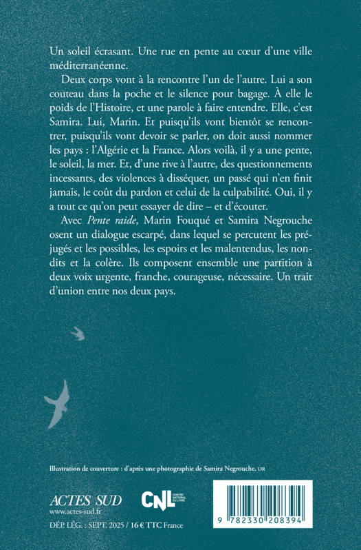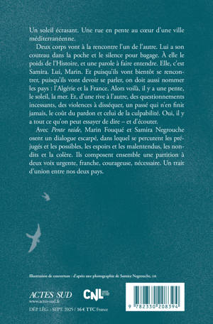 Un soleil écrasant. Une rue en pente au coeur d'une ville méditerranéenne. Deux corps vont à la rencontre l'un de l'autre. Lui a son couteau dans la poche et le silence pour bagage. À elle le poids de l'Histoire, et une parole à faire entendre. Elle, c'est Samira. Lui, Marin. Et puisqu'ils vont bientôt se rencontrer, puisqu'ils vont devoir se parler, on doit aussi nommer les pays : l'Algérie et la France. Alors voilà, il y a une pente, le soleil, la mer. Et, d'une rive à l'autre, des questionnements incessants, des violences à disséquer, un passé qui n'en finit jamais, le coût du pardon et celui de la culpabilité. Oui, il y a tout ce qu'on peut essayer de dire - et d'écouter. Avec "Pente raide", Marin Fouqué et Samira Negrouche osent un dialogue escarpé, dans lequel se percutent les préjugés et les possibles, les espoirs et les malentendus, les non-dits et la colère. Ils composent ensemble une partition à deux voix urgente, franche, courageuse, nécessaire. Un trait d'union entre nos deux pays.