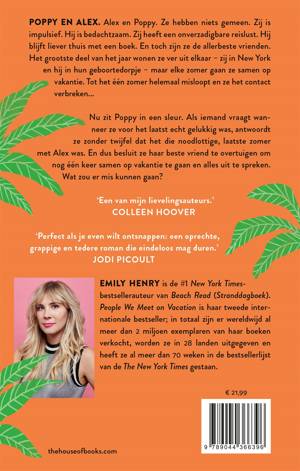 Poppy en Alex. Alex en Poppy. Ze hebben niets gemeen. Zij is impulsief. Hij is bedachtzaam. Zij heeft een onverzadigbare reislust. Hij blijft liever thuis met een boek. En toch zijn ze de allerbeste vrienden. Het grootste deel van het jaar wonen ze ver uit elkaar - zij in New York City en hij in hun geboortedorpje - maar elke zomer gaan ze samen op vakantie. Tot het één zomer helemaal misloopt...