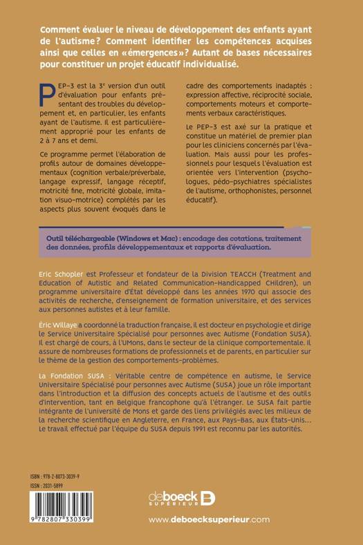 Le PEP-3 est la troisième version d'un outil d'évaluation pour enfants présentant des troubles du développement (l'autisme en particulier). Il est parfaitement adapté aux enfants de 2 à 7 ans 1/2.