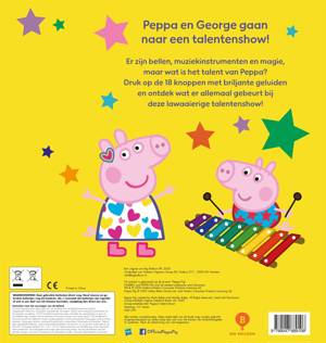 'Peppa is een ster!': een Peppa Pig-kartonboek waarin Peppa en George naar een talentenshow gaan. Er is muziek, magie en een pratende papegaai. George treedt op met Papa Big, maar wat is het talent van Peppa? Dit kartonboek met 18 geluiden is een vrolijk verhaal dat op een speelse manier laat zien dat iedereen een talent heeft. Ontdek onderaan elke pagina kleine tekeningetjes die verwijzen naar geluiden passend bij de illustratie. Door de combinatie met geluiden wordt voorlezen interactief en uitdagend. Een leuk Peppa Pig-boek geschikt voor kinderen vanaf 2 jaar.