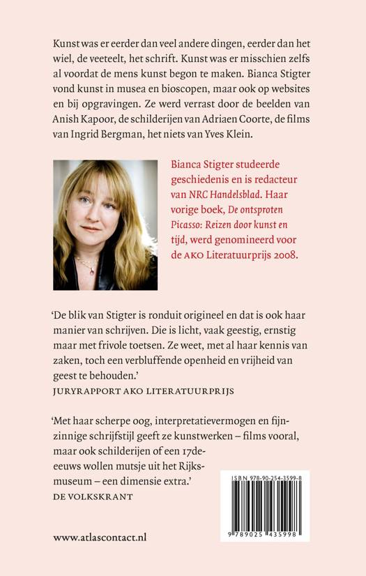 Kunst was er eerder dan veel andere dingen, eerder dan het wiel, de veeteelt, het schrift. Kunst was er misschien zelfs al voordat de mens kunst begon te maken. Bianca Stigter vond kunst in musea en bioscopen, maar ook op websites en opgravingen, op schilderijen en beelden, maar ook in fossielen en stervende vissen, in nieuwe kerken en oude televisieseries, in sproeten en plastic. Stigter werd verrast door de beelden van Anish Kapoor, de gebouwen van Peter Zumthor, de schilderijen van Adriaan Coorte, de films van Ingrid Bergman, het niets van Yves Klein.