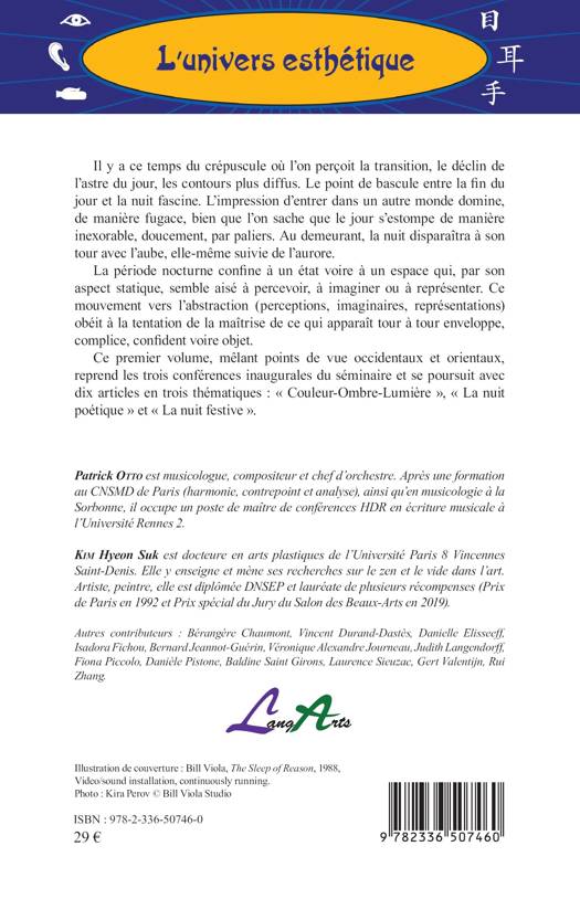 Il y a ce temps du crépuscule où l'on perçoit la transition, le déclin de l'astre du jour, les contours plus diffus. Le point de bascule entre la fin du jour et la nuit fascine. L'impression d'entrer dans un autre monde domine, de manière fugace, bien que l'on sache que le jour s'estompe de manière inexorable, doucement, par paliers. Au demeurant, la nuit disparaîtra à son tour avec l'aube, elle-même suivie de l'aurore. La période nocturne confine à un état voire à un espace qui, par son aspect statique, semble aisé à percevoir, à imaginer ou à représenter. Ce mouvement vers l'abstraction (perceptions, imaginaires, représentations) obéit à la tentation de la maîtrise de ce qui apparaît tour à tour enveloppe, complice, confident voire objet. Ce premier volume, mêlant points de vue occidentaux et orientaux, reprend les trois conférences inaugurales du séminaire et se poursuit avec dix articles en trois thématiques: Couleur-Ombre-Lumière, La nuit poétique et La nuit festive .