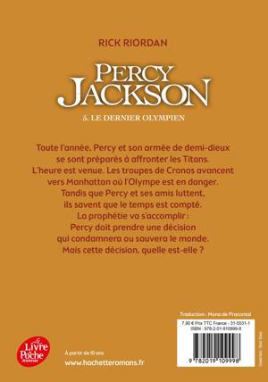 Toute l'année, Percy et son armée de demi-dieux se sont préparés à affronter les Titans. L'heure est venue. Les troupes de Cronos avancent vers Manhattan où l'Olympe est en danger. Tandis que Percy et ses amis luttent, ils savent que le temps est compté. La prophétie va s'accomplir : Percy prendra une décision qui condamnera ou sauvera le monde. Mais cette décision, quelle est-elle ?