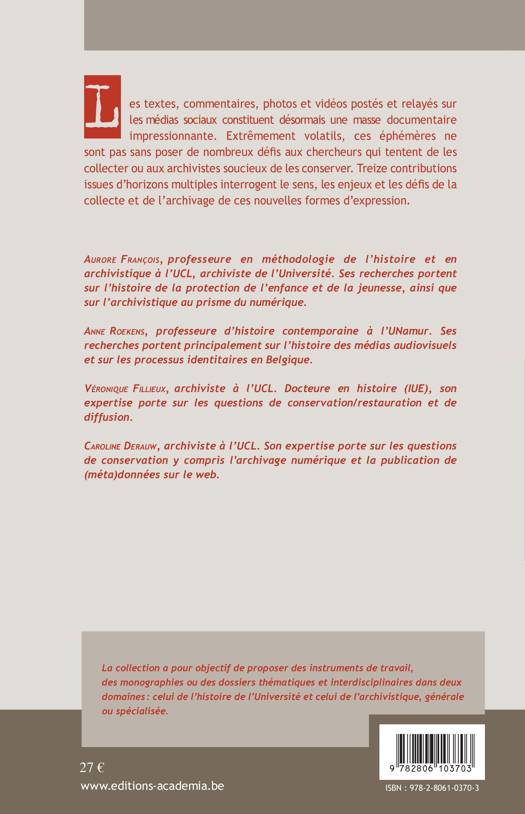 Les textes, commentaires, photos et vidéos postés et relayés sur les médias sociaux constituent désormais une masse documentaire impressionnante. Extrêmement volatils, ces éphémères ne sont pas sans poser de nombreux défis aux chercheurs qui tentent de les collecter ou aux archivistes soucieux de les conserver. Treize contributions issues d'horizons multiples interrogent le sens, les enjeux et les défis de la collecte et de l'archivage de ces nouvelles formes d'expression.