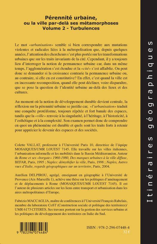 Au moment où la notion de développement durable devient centrale, la réflexion sur la pérennité urbaine se justifie, car l'urbanisation traduit une conquête protéiforme, répétitive et banale des espaces tandis que la ville renvoie à la singularité, à l'héritage, à l'historicité, à l'esthétique et à la complexité. La croissance contrarie-t-elle la permanence urbaine ou bien en est-elle constitutive ? Cet examen se décline sur trois volumes. Ce deuxième tome pose la question de la turbulence auquelle la ville est soumise.
