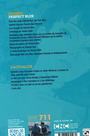 Entretien avec Satoshi Kon, par Tom Mes Satoshi Kon par Pascal-Alex Vincent Les mondes de Satoshi Kon L'héritage de Perfect Blue Entretiens avec Matthieu Pinon, sur la carrière de mangaka de Satoshi Kon et avec Marie Pruvost-Delaspre sur le cinéma d'animation japonais pour adultes Revue de presse de Perfect Blue La fiche technique de Perfect Blue Découpage plan par plan, dialogues français et vidéogrammes