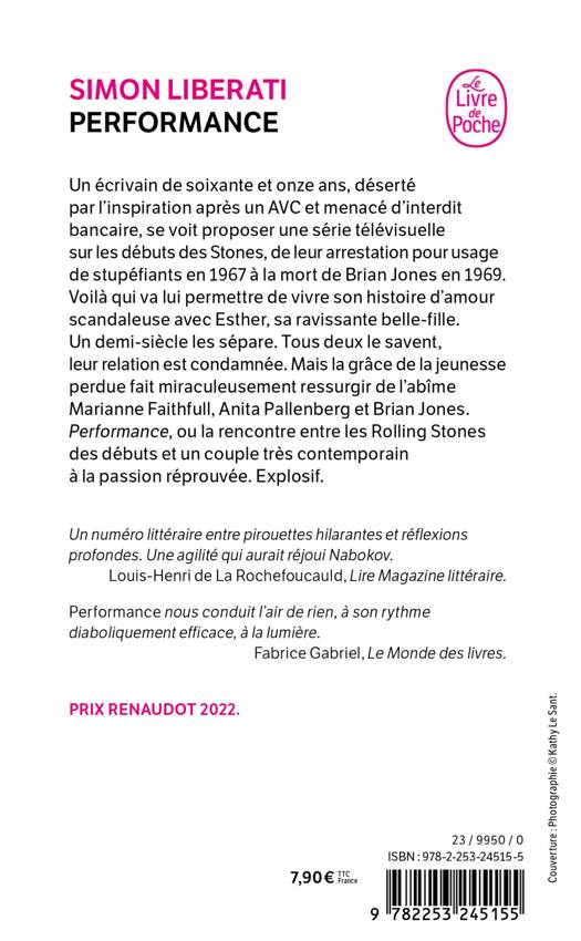 Un écrivain de soixante et onze ans, déserté par l’inspiration après un AVC et menacé d’interdit bancaire, se voit proposer une série télévisuelle sur les débuts des Stones, de leur arrestation pour usage de stupéfiants en 1967 à la mort de Brian Jones en 1969. Voilà qui va lui permettre de vivre son histoire d’amour scandaleuse avec Esther, sa ravissante belle-fille, dont un demi-siècle le sépare. Tous deux le savent, leur relation est condamnée. Mais la grâce de la jeunesse perdue fait miraculeusement ressurgir de l’abîme Marianne Faithfull, Anita Pallenberg et Brian Jones. Performance, ou la rencontre explosive entre les Rolling Stones des débuts et un couple très contemporain à la passion réprouvée. Explosif.