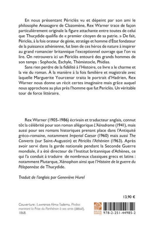 En nous presentant Pericles vu et depeint par son ami le philosophe Anaxagore de Clazomene, Rex Warner trace de facon particulierement originale la figure attachante entre toutes de celui que Thucydide qualifia de " premier citoyen de sa patrie. " De fait, Pericles, a la fois orateur de genie, stratege et homme d'Etat fondateur de la puissance athenienne, fut bien de ces heros de nature a inspirer au grand romancier britannique l'exceptionnel ouvrage que l'on va lire. On retrouvera ici un Pericles entoure des grands hommes de son temps: Sophocle, Eschyle, Themistocle, Phidias. Sans rien perdre de la fidelite a l'Histoire, ce livre a le charme et la vie du roman. A la maniere a la fois familiere et magistrale avec laquelle Marguerite Yourcenar traita le portrait d'Hadrien, Rex Warner nous donne un recit certes imaginaire mais grace auquel nous approchons au plus pres l'homme que fut Pericles. Un veritable tour de force litteraire.