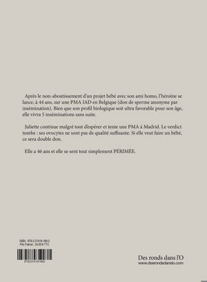 Après le non-aboutissement d’un projet bébé avec son ami homo, l’héroïne se lance, à 44 ans, sur une PMA IAD en Belgique ( don de sperme anonyme par insémination). Bien que son profil biologique soit ultra favorable pour son âge, elle vivra 5 inséminations sans suite. Juliette continue malgré tout d’espérer et tente une PMA à Madrid . Le verdict tombe : ses ovocytes ne sont pas de qualité suffisante. Si elle veut faire un bébé, ce sera double don. Elle a 46 ans et elle se sent tout simplement PÉRIMÉE. Périmée pour procréer avec ses propres gènes. Périmée dans ses relations amoureuses. Qui voudra d’une fille qui ne peutmême plus offrir une descendance ? Périmée en elle-même. Pour autant Périmée n'est pas un récit pessimiste. Il raconte la vie et les désirs d'une femme face à une réalité douloureuse pour elle, qu'elle va savoir transformer vers une voie différente et résiliente.
