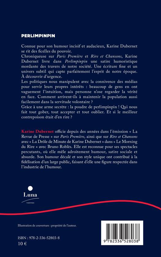 Connue pour son humour incisif et audacieux, Karine Dubernet se rit des ficelles du pouvoir. Chroniqueuse sur Paris Première et Rire et Chansons, Karine Dubernet livre dans Perlimpinpin une satire humoristique mordante des travers de notre société. Une écriture fine et un univers subtil qui capte parfaitement l'esprit de notre époque. À découvrir d'urgence. Les politiques nous manipulent avec la connivence des médias pour servir leurs propres intérêts: beaucoup de gens en ont vaguement l'intuition, mais personne n'ose regarder la vérité en face. Comment arrivent-ils à maintenir la population aussi facilement dans la servitude volontaire ? Grâce à une arme secrète: la poudre de perlimpinpin ! Qui nous fait tout gober, tout accepter et tout oublier. Et si le meilleur contrepoison était d'en rire ?