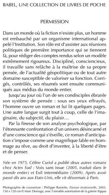 Dans un monde où la fiction n'existe plus, un homme est embauché par un organisme international appelé l'Institution. Son rôle est d'assister aux réunions politiques de première importance qui se tiennent là, pour rédiger des comptes rendus selon un modèle extrêmement rigoureux. Discipliné, consciencieux, il travaille sans relâche à la maîtrise de sa propre pensée, de l'actualité géopolitique ou de tout autre domaine susceptible de valoriser sa fonction. Corrigés, contrôlés, ses résumés sont ensuite communiqués aux médias du monde entier. Jusqu'au jour où l'un de ses condisciples ébranle son système de pensée : sous ses yeux effrayés, l'homme ouvre un roman et lui lit quelques pages. Une autre langue surgit tout à coup, celle de l'imaginaire, du subjectif, du plaisir... Par la finesse de son analyse psychologique, par l'étonnante confrontation d'un univers désincarné et d'une conscience qui s'éveille, ce roman d'anticipation s'impose comme une magnifi que fable en hommage au rêve, au droit d'inventer, à la liberté d'être et de penser.