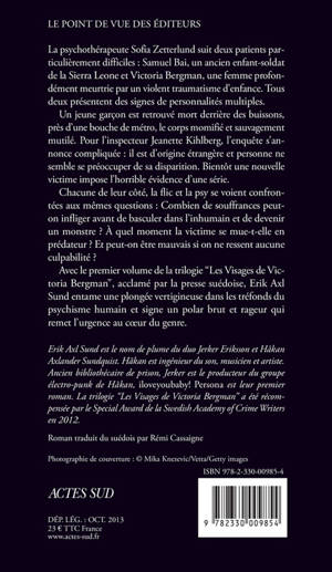 Avec le premier volume de la trilogie "Les Visages de Victoria Bergman", acclamé par la presse suédoise, Erik Axl Sund entame une plongée vertigineuse dans les tréfonds du psychisme humain et signe un polar brut et rageur qui remet l'urgence au coeur du genre.