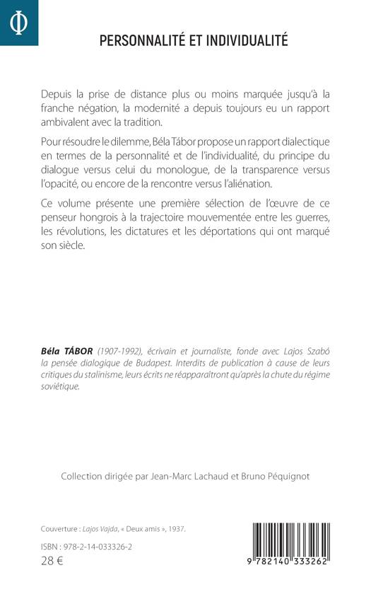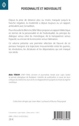 Depuis la prise de distance plus ou moins marquée jusqu'à la franche négation, la modernité a depuis toujours eu un rapport ambivalent avec la tradition. Pour résoudre le dilemme, Béla Tábor propose un rapport dialectique en termes de la personnalité et de l'individualité, du principe du dialogue versus celui du monologue, de la transparence versus l'opacité, ou encore de la rencontre versus l'aliénation. Ce volume présente une première sélection de l'oeuvre de ce penseur hongrois à la trajectoire mouvementée entre les guerres, les révolutions, les dictatures et les déportations qui ont marqué son siècle.
