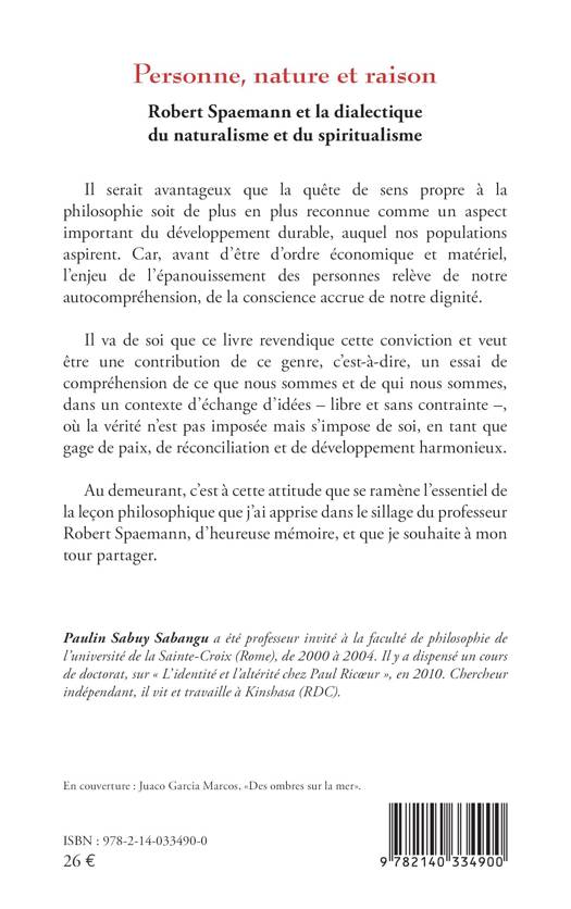 Il serait avantageux que la quête de sens propre à la philosophie soit de plus en plus reconnue comme un aspect important du développement durable, auquel nos populations aspirent. Car, avant d'être d'ordre économique et matériel, l'enjeu de l'épanouissement des personnes relève de notre autocompréhension, de la conscience accrue de notre dignité. Il va de soi que ce livre revendique cette conviction et veut être une contribution de ce genre, c'est-à-dire, un essai de compréhension de ce que nous sommes et de qui nous sommes, dans un contexte d'échange d'idées - libre et sans contrainte -, où la vérité n'est pas imposée mais s'impose de soi, en tant que gage de paix, de réconciliation et de développement harmonieux. Au demeurant, c'est à cette attitude que se ramène l'essentiel de la leçon philosophique que j'ai apprise dans le sillage du professeur Robert Spaemann, d'heureuse mémoire, et que je souhaite à mon tour partager.