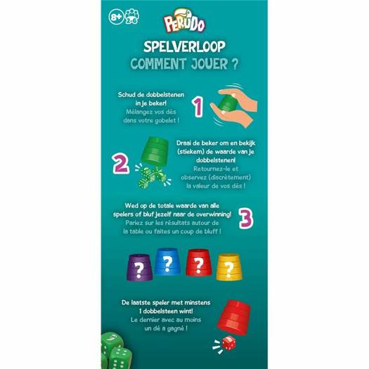 Dans Perudo, vous allez devoir faire preuve de ruse et d'habileté pour tromper vos adversaires (accompagné d'une pointe de chance). Cachez vos 5 dés sous votre gobelet puis au top, secouez-le. Seul vous saurez quel tirage vous avez obtenu. C'est alors que le bluff peut commencer ! Le principe du jeu consiste à déterminer combien de dés d'une même face il y a sur l'ensemble des dés de tous les joueurs. Vous connaissez les vôtres mais devez déterminer ceux de vos adversaires selon leurs annonces, leurs attitudes et comportements.