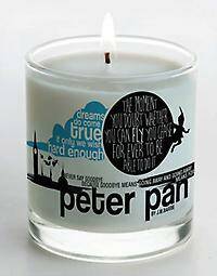 Hand Poured Fragranced candles in a glass cup. Cool gift for true book lovers. Romantic and really delicate gift item. Contemporary designed to make a statement. "Dreams do come true if only we wish hard enough"- and many more popular quotes from a classic tale for Peter Pan by J.M. Barrie is part of the candle design.