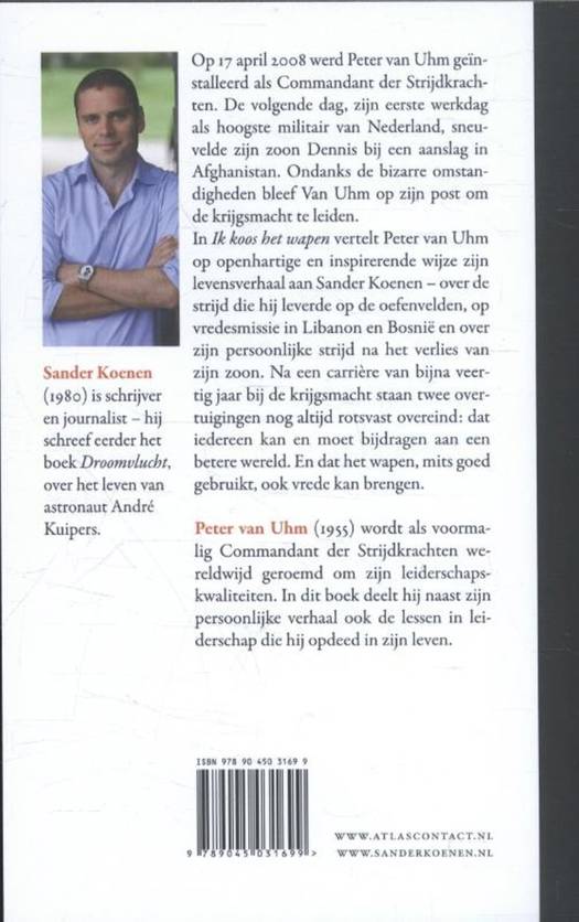 Op 17 april 2008 werd Peter van Uhm geïnstalleerd als Commandant der Strijdkrachten. De volgende dag, zijn eerste werkdag als hoogste militair van Nederland, sneuvelde zijn zoon Dennis bij een aanslag in Afghanistan. Ondanks de bizarre omstandigheden bleef Van Uhm op zijn post om de krijgsmacht te leiden. In Ik koos het wapen vertelt Peter van Uhm op openhartige en inspirerende wijze zijn levensverhaal aan Sander Koenen over de strijd die hij leverde op de oefenvelden, op vredesmissie in Libanon en Bosnië en over zijn persoonlijke strijd na het verlies van zijn zoon. Na een carrière van bijna veertig jaar bij de krijgsmacht staan twee overtuigingen nog altijd rotsvast overeind: dat iedereen kan en moet bijdragen aan een betere wereld. En dat het wapen, mits goed gebruikt, ook vrede kan brengen.