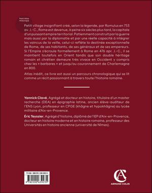Des origines mythiques de Rome à la fin de de l'empire et des rives de la Méditerranée aux frontières du Nord et de l'Asie, ce sont dix siècles et de gigantesques espaces que présente en 42 fiches cet ouvrage. Il dresse le tableau le plus complet de la très longue histoire de l'Antiquité romaine, depuis les origines mythiques de Rome, au VIIIe s. av. J.-C., jusqu’à la bataille de Poitiers en 732 où triomphent les Francs, bâtisseurs d’un royaume occidental sur les ruines de l’Empire.