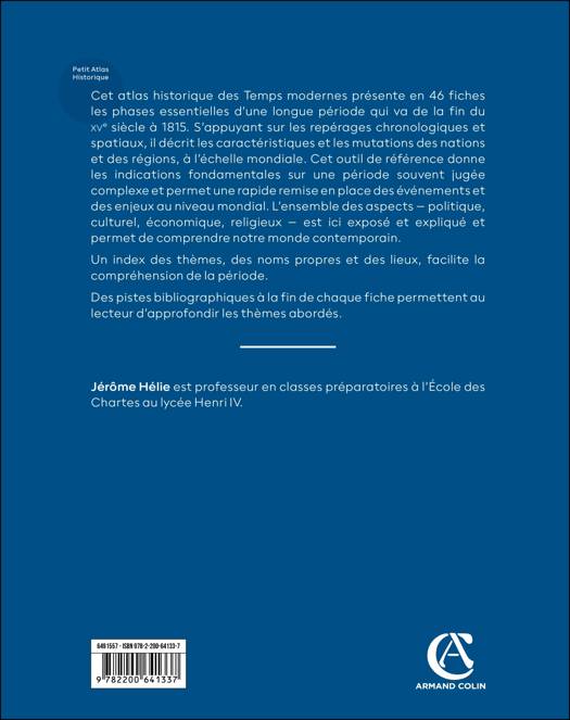 Cet atlas historique des Temps modernes présente en 46 fiches les phases essentielles d’une longue période qui va de la fin du XVe siècle à 1815. S’appuyant sur les repérages chronologiques et spatiaux, il décrit les caractéristiques et les mutations des nations et des régions, à l'échelle mondiale. Cet outil de référence donne les indications fondamentales sur une période souvent jugée complexe et permet une rapide remise en place desévénements et des enjeux au niveau mondial. L’ensemble des aspects – politique, culturel, économique, religieux – est ici exposé et expliqué et permet de comprendre notre monde contemporain. Un index des thèmes, des noms propres et des lieux, facilite la compréhension de la période. Des pistes bibliographiques à la fin de chaque fiche permettent au lecteur d’approfondir les thèmes abordés.