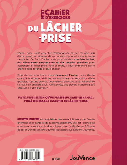 Lâcher prise, c’est accepter d’abandonner ce qui n’a plus lieu d’être, savoir se détacher de ce qui est trop lourd, vivre en toute simplicité. Ce Petit Cahier vous propose des exercices faciles, des découvertes surprenantes et des pensées positives pour apprendre à lâcher prise. Futé et drôle, il vous emmènera au quotidien sur le chemin de la sérénité et du bonheur. Emportez-le partout pour vivre pleinement l’instant, la vie. Quelle que soit la situation difficile que vous traversez (émotions négatives, rupture, divorce, dépendance affective…), le lâcher-prise se révèle un outil précieux. Alors, sortez vos crayons et donnez des couleurs à votre quotidien !