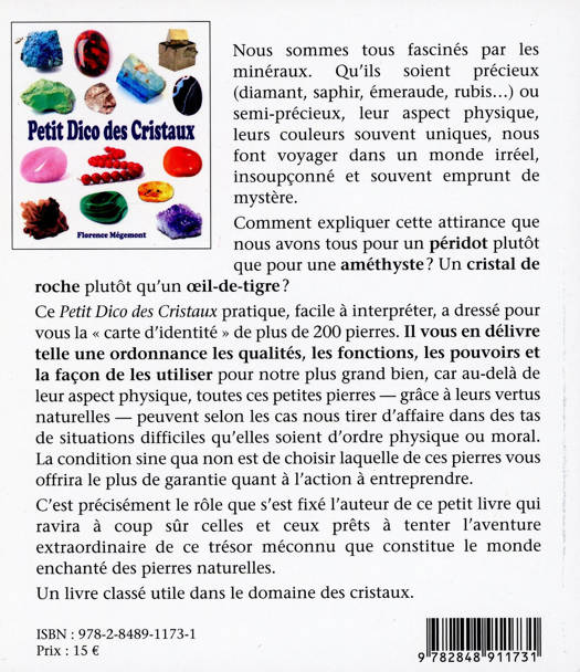 Nous sommes tous fascinés par les minéraux. Qu'ils soient précieux (diamant, saphir, émeraude, rubis...) ou semi-précieux, leur aspect physique, leurs couleurs souvent uniques, nous font voyager dans un monde irréel, insoupçonné et souvent emprunt de mystère. Comment expliquer cette attirance que nous avons tous pour un péridot plutôt que pour une améthyste ? Un cristal de roche plutôt qu'un oeil-de-tigre ? Ce Petit Dico des Cristaux pratique, facile à interpréter, a dressé pour vous la "carte d'identité" de plus de 200 pierres. Il vous en délivre telle une ordonnance les qualités, les fonctions, les pouvoirs et la façon de les utiliser pour notre plus grand bien, car au-delà de leur aspect physique, toutes ces petites pierres - grâce à leurs vertus naturelles - peuvent selon les cas nous tirer d'affaire dans des tas de situations difficiles qu'elles soient d'ordre physique ou moral. La condition sine qua non est de choisir laquelle de ces pierres vous offrira le plus de garantie quant à l'action à entreprendre. C'est précisément le rôle que s'est fixé l'auteur de ce petit livre qui ravira à coup sûr celles et ceux prêts à tenter l'aventure extraordinaire de ce trésor méconnu que constitue le monde enchanté des pierres naturelles. Un livre classé utile dans le domaine des cristaux.