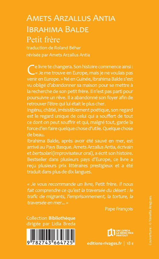 Ce livre te changera. Son histoire commence ainsi : « Je me trouve en Europe, mais je ne voulais pas venir en Europe. » Né en Guinée, Ibrahima Balde s'est vu obligé d'abandonner sa maison pour se mettre à la recherche de son petit frère. Il n'est pas parti pour poursuivre un rêve. Il a abandonné son foyer afin de retrouver l'être qui lui était le plus cher. Ingénu, châtié, irrésistiblement poétique, son regard est le regard unique de celui qui a souffert de tout ce dont on peut souffrir et qui, malgré tout, garde la force d'en faire quelque chose d'utile. Quelque chose de beau. « Je vous recommande un livre, Petit frère. Il nous fait comprendre ce qu'est la traversée du désert : le trafic de migrants, l'emprisonnement, la torture, la traversée en mer... » (Pape FRANÇOIS)