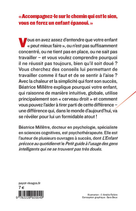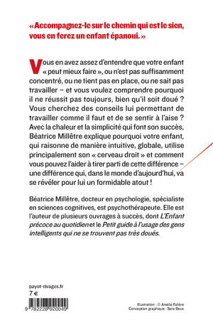 Vous en avez assez d'entendre que votre enfant « peut mieux faire », ou n'est pas suffisamment concentré, ou ne tient pas en place, ou ne sait pas travailler - et vous voulez comprendre pourquoi il ne réussit pas toujours, bien qu'il soit doué ? Vous cherchez des conseils lui permettant de travailler comme il faut et de se sentir à l'aise ? Avec la chaleur et la simplicité qui font son succès, Béatrice Millêtre explique pourquoi votre enfant, qui raisonne de manière intuitive, globale, utilise principalement son « cerveau droit » et comment vous pouvez l'aider à tirer parti de cette différence - une différence qui, dans le monde d'aujourd'hui, va se révéler pour lui un formidable atout !